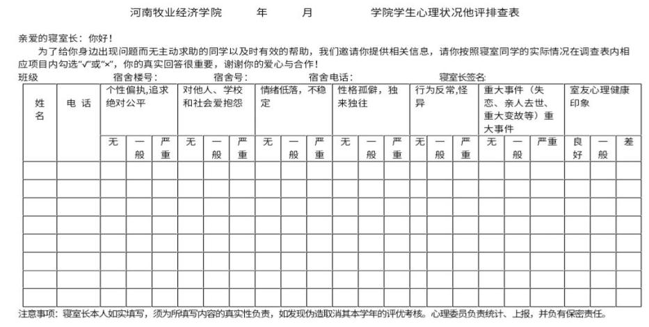 买球官网心教部于2020年10月13日至2020年10月16日对17,18,19,20级学生进行本月的心理健康排查工作,寝室长以寝室为单位进行统计,随后心理委员进行汇总并将结果发给团学会心教部干事,由心教部负责人收集后进行筛选,最后发给所属辅导员。辅导员根据具体情况对有心理问题的同学进行进一步谈话,深入了解指导。