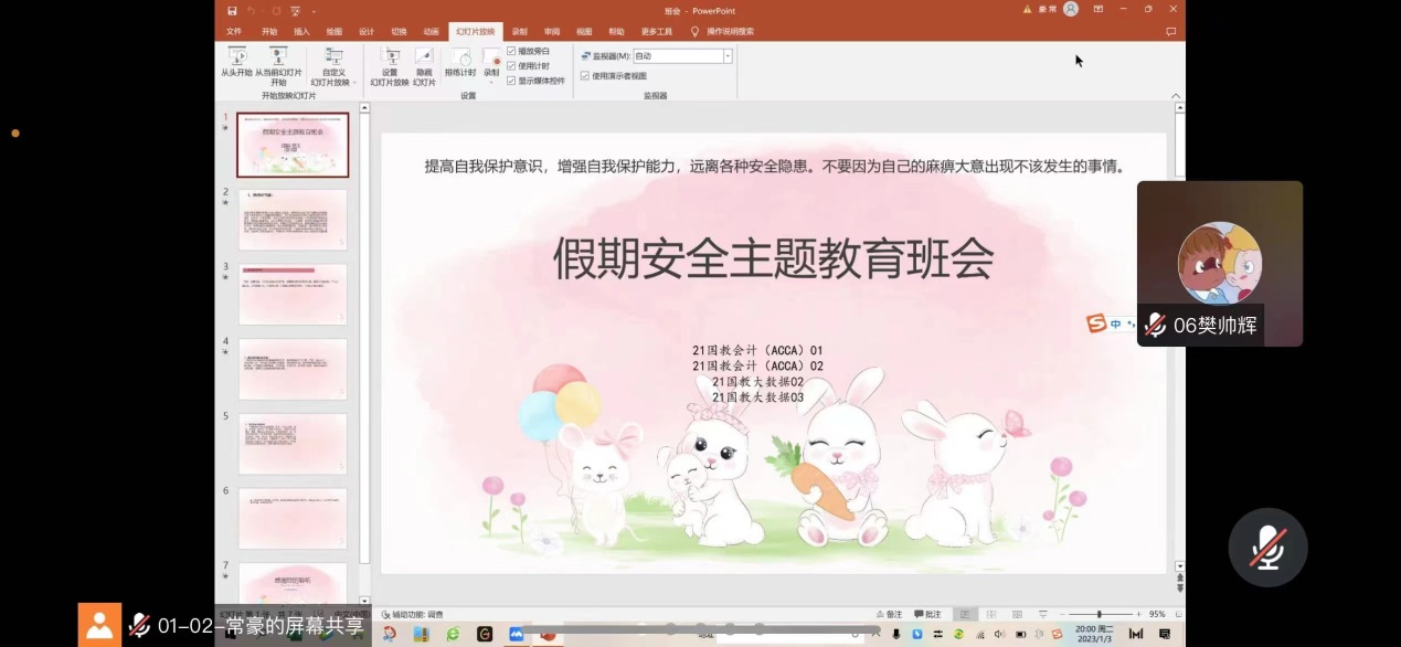 会上,各班辅导员强调每个人是自身安全健康的第一责任人。一是疫情安全。疫情时代,病毒活跃,传播速度快,因此在寒假期间一定要注意个人防护,做好戴口罩、勤洗手、常通风、不聚集,保持安全社交距离等个人防护。二是严防诈骗。老师们结合近期高校网络诈骗和非法传销等案件,让学生详细了解受骗方式,提醒同学们要注意个人信息的保护,识别并防范网络诈骗等陷阱,牢记“心中无贪念,骗局远身边”。三是交通安全。春节期间是走访亲友的高峰期,也是各类交通安全事故多发期,外出一定要遵守交通规则,注意行车、乘车安全,做到文明行车。四是用电防火安全。冬天天气干燥,要养成良好的生活行为习惯,管理好“小太阳”等取暖设备,切忌在人多杂物多的地方燃放烟花爆竹,为家人和自身筑建安全的生活环境。最后,老师们提醒同学们要做好假期规划,合理安排学习,积极参加家乡抗疫防疫志愿服务工作和社会实践活动,让自己度过一个充实而有意义的假期。