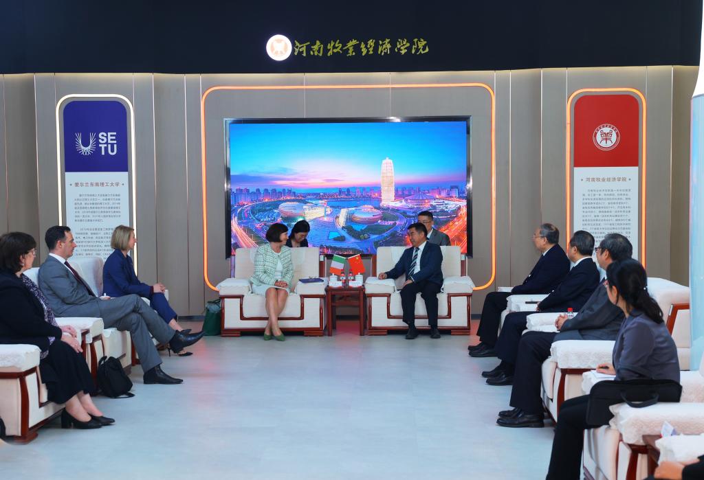 刁玉华对安黛文一行来河南访问表示欢迎。他说,河南省近年来持续加快和扩大教育对外开放,深入推进“一带一路”教育行动,与世界90余个国家和地区开展了教育交流与合作,国际“朋友圈”不断扩大;积极引进国外优质教育资源,与国外高水平大学合作办学规模和质量不断提升,尤其是在两国政府的支持和双方大学的努力下,我省与爱尔兰合作的本科项目和机构已有5家,给河南考生提供了非常好的享受国际优质教育的机会。他对爱尔兰大使馆长期以来不遗余力支持河南与爱尔兰的教育合作表示赞赏,对爱尔兰东南理工大学倾注大量心血支持买球官方网站卡洛理工国际学院建设和发展表示感谢,对卡洛理工国际学院正式设立并顺利运行表示祝贺。希望两校通过卡洛理工国际学院这一平台,在人才培养、学科建设、教师发展、人文交流等方面务实合作,持续加大教育资源投入,努力把卡洛理工国际学院建设成为高水平示范性中外合作办学机构,为两校发展和中爱友谊做出更大贡献!