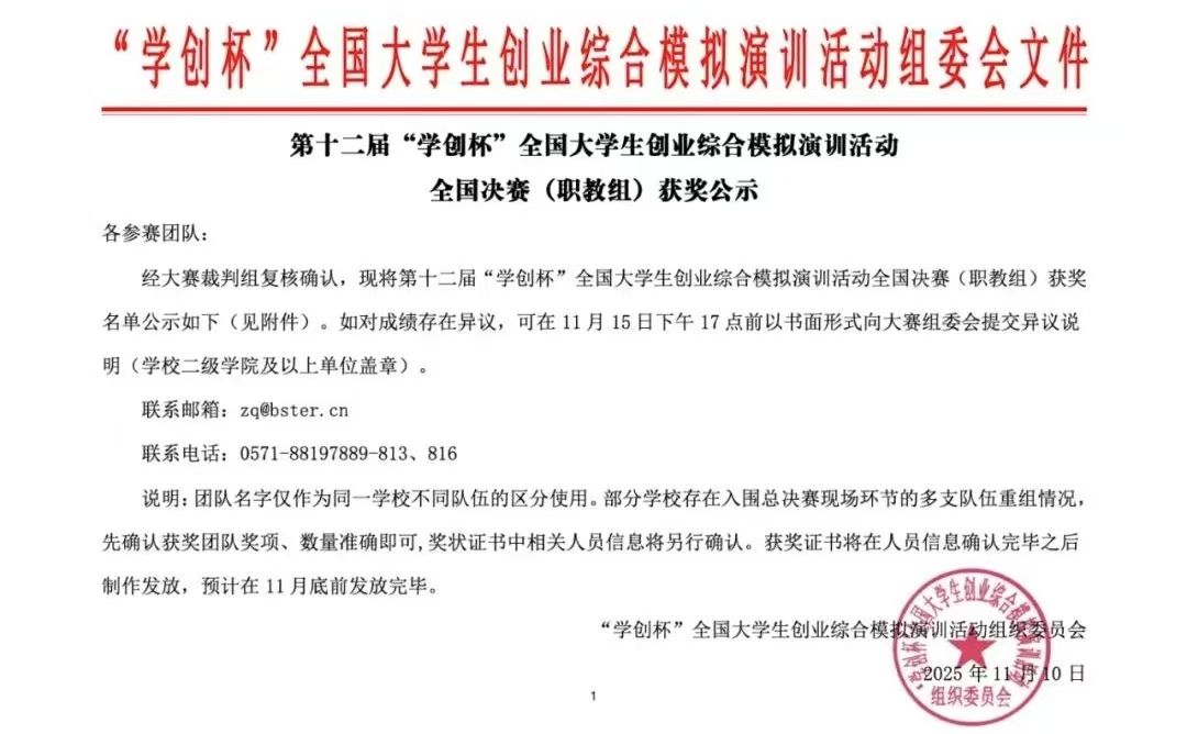 2025年11月9日,第十二届“学创杯”学生创业综合模拟演训比赛(职教组)财务决策模拟赛项在威海职业学院圆满落幕。买球官网大数据与会计专业学生宋昱、魏士轲、乔羽组成的参赛团队,凭借扎实的专业功底、出色的财务决策能力与高效的团队协作,从众多参赛队伍中脱颖而出,成功斩获该赛项全国一等奖,指导老师安兵、刘天宇荣获“优秀指导教师奖”。