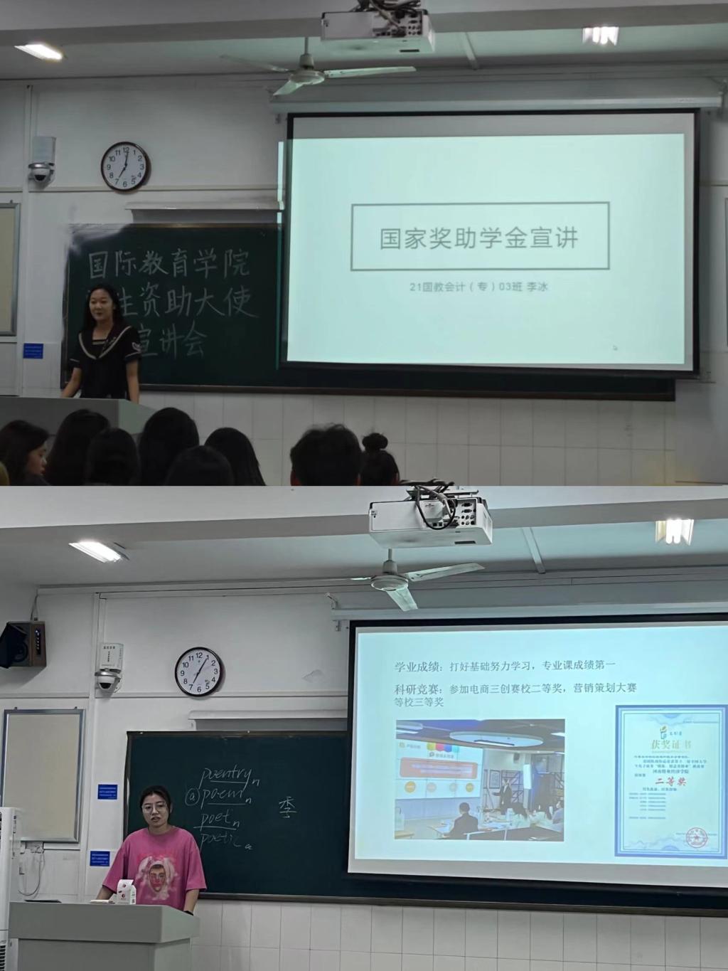 此次宣讲由买球官网学生资助大使21大数据02班王宇澄、21会计02班李冰主讲,资助专干侯思琦老师为两位同学颁发聘书。两位同学在22级新生中展开经验分享,内容围绕奖学金的奖励标准与申请条件,同时结合自身学习、工作获奖情况,和同学们交流学习。王宇澄最后说道:“志之所趋,无远弗届——一个人如果有足够的志向,他要到达的地方无论多远,最终都能到达。”两位同学充分发挥榜样力量,激励同学们勇敢追逐梦想。