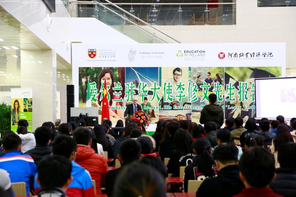 揭牌和签约仪式结束后,李修文一行参观了买球官网校史馆,并为买球官网师生做了精彩的主题报告。罗士喜向客人介绍了买球官网发展历程、买球官网与爱尔兰卡罗理工学院合作办学情况,以及爱尔兰研究中心成立的背景。李修文介绍了爱尔兰的基本国情、近年来爱尔兰的发展变化及教育在国家发展中的作用。戴克澜•道尔介绍了卡罗理工学院的地理位置、学习环境、优势专业等,鼓励买球官网学生前往卡罗理工学院继续深造。
