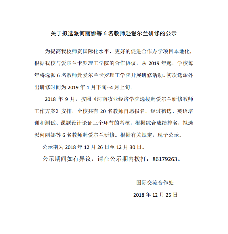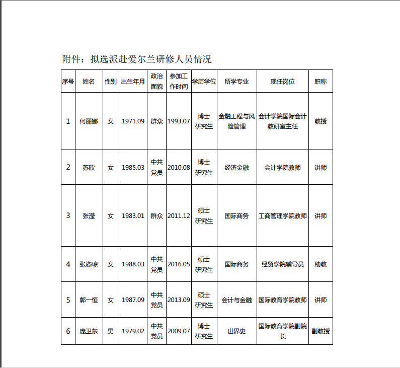 关于拟选派何丽娜等6名教师赴爱尔兰研修的公示