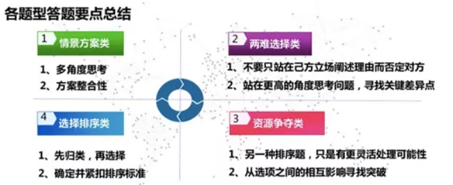 这类问题会涉及到自身利益和其他利益冲突时的分配,需要应试者有足够的反应灵敏度,对资源分配的会引起的结果有尽可能全面的考虑。一个完全完美的资源分配方案几乎是不可能的,在资源争夺中,既要保证自身利益,也要注意团队协作,避免显得攻击性过强。同时确定好分配方案最终的目的,也即这样分配的好处,并对一些不足针对提出一些补救方案。